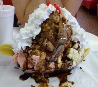 A perfectly ripened banana, sliced lengthwise, on the bottom, large scoops of strawberry and vanilla ice cream on the bottom, an equally huge scoop of chocolate ice cream on top of that, chocolate sauce, walnuts and whipped cream. Oh! And a maraschino cherry on top, of course. We did our very best to finish it, but just couldn't.